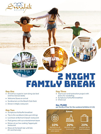 Nestled on the pristine white sands of Diani Beach, Swahili Beach offers a perfect blend of history, culture, and natural beauty. From the sacred Kaaya forests to the vibrant local communities, every corner tells a story of Kenya’s rich heritage. As you bask in the sun and explore, we kindly ask you to respect local customs, reflecting our deep appreciation for this remarkable destination.